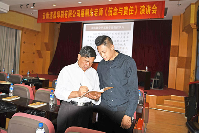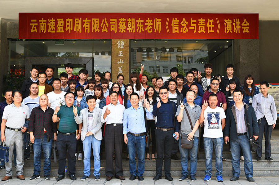 2017年5月10日上午,是《理解萬歲》的創(chuàng)始人蔡朝東老師給云南速盈印刷有限公司整個團(tuán)隊作專場講座的日子。蔡朝東老師不但是中國的十大演講家之一,更是亞洲八大名師之一,也是中國的第一位民選縣長……蔡朝東老師身上的光環(huán)不在一一贅述??梢哉f蔡老師的奉獻(xiàn)和傳播正能量的精神不但影響了我們的上一輩、我們自己這一輩、同時也影響著下一輩乃至后輩的無數(shù)中華兒女。
