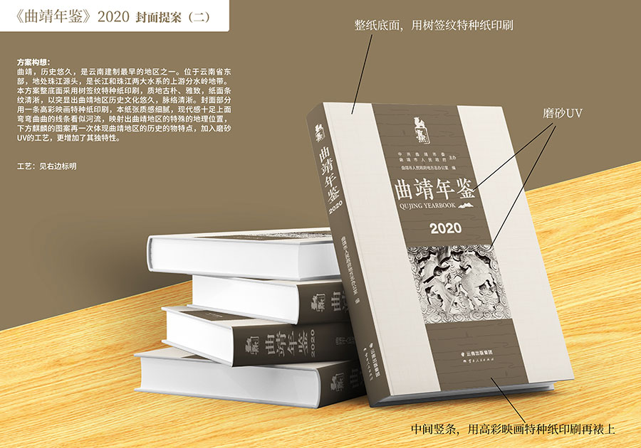 本方案整底面采用樹簽紋特種紙印刷,質地古樸、雅致,紙面條紋清淅,以突顯出曲靖地區(qū)歷史文化悠久,脈絡清淅。