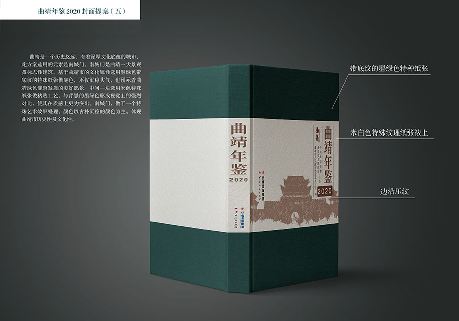 曲靖是一個歷史悠遠,有著深厚文化底蘊的城市,此方案選用的元素是南城門,南城門是曲靖一大景觀及標志性建筑?;谇甘械奈幕瘜傩赃x用墨綠色帶底紋的特殊紙張做底色,不僅沉穩(wěn)大氣,也預(yù)示著曲靖綠色健康發(fā)展的美好愿景。中間一塊選用米色特殊紙張做粘貼工藝,與背景的墨綠色形成視覺上的強烈對比,使其在質(zhì)感上更為突出。南城門,做了一個特殊藝術(shù)效果處理,顏色以古樸沉穩(wěn)的顏色為主,體現(xiàn)曲靖市歷史性及文化性。
